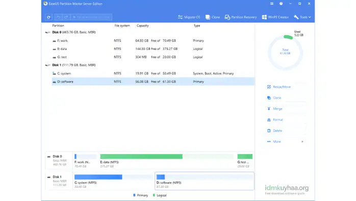 - Buat, ubah ukuran, pindahkan, gabungkan, pisahkan, format, hapus, hapus, dan klon partisi dengan mudah.